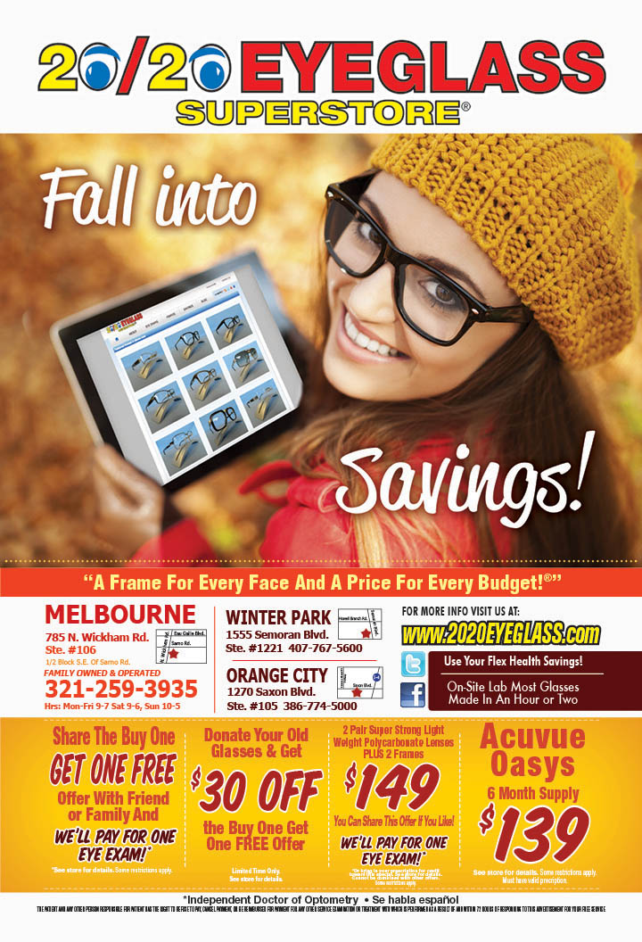 Fall into Savings with 20/20 Eyeglass Superstore this Autumn Season! If you live in Winter Park, Melbourne and/or Orange City, and you’re on the market for new eyeglasses or contact lenses, you’ve landed in the right place! Our tagline is “A Frame For Every Face and a Price For Every Budget”, and we guarantee we’ll have frames you love at a price you can afford. Check out our latest Fall 2014 deals: